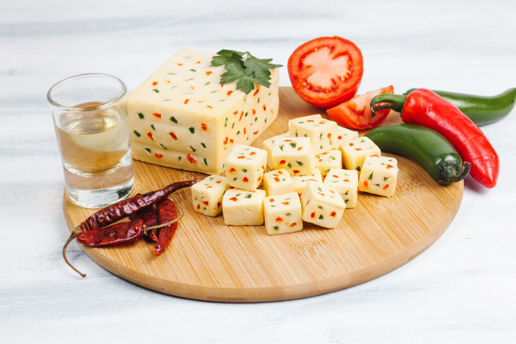 Queso Chihuahua con Chili ist ein halbfester, gereifter Pasta-Filata-Käse aus pasteurisierter Kuhmilch, der mit ausgewählten Chilistückchen verfeinert wird. Die Basis bildet klassischer Queso Chihuahua, der durch enzymatische Gerinnung, Pressen und einen schonenden Reifeprozess hergestellt wird. Anschließend werden dem Käse Chili hinzugefügt, die für eine angenehme, aber nicht dominante Schärfe sorgen.